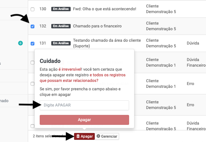 Para apagar registros do Fluxki, selecione-os na lista, e clique em “Apagar”, confirme a ação digitando “APAGAR" na caixa de texto, conforme a imagem abaixo: