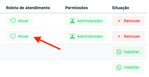 Para habilitar os usuários disponíveis, acesse o menu de usuários do Fluxki WhatsApp, em seguida clique no botão ativar conforme a imagem abaixo