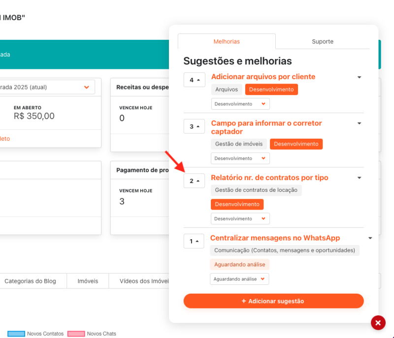 Estamos sempre buscando evoluir junto com nossos clientes — por isso, adicionamos uma nova funcionalidade ao sistema que torna você parte ativa da construção do Cim Imob: a ferramenta de sugestões com votação.