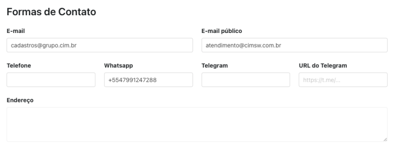 O próximo item é as Formas de contato. Aqui você poderá configurar o e-mail de contato, número de telefone, WhatsApp, Telegram e o Endereço da empresa.