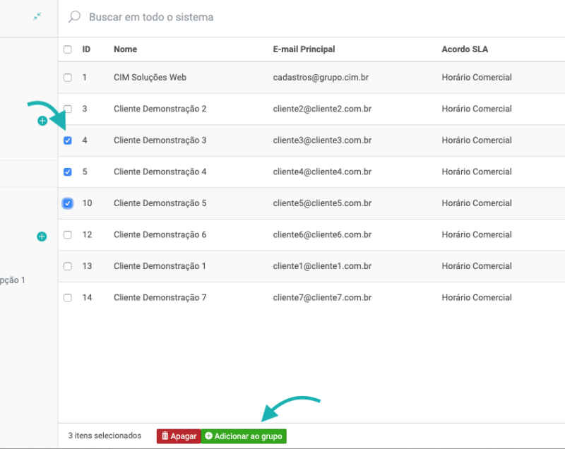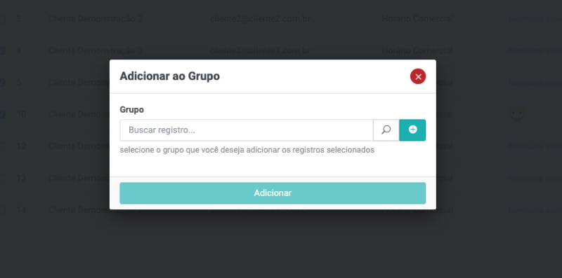 Na lista dos registro, selecione os clientes que deseja adicionar ao grupo. E em seguida clique em Adicionar ao grupo, conforme demonstrado na imagem abaixo: