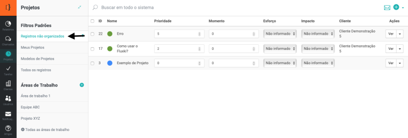 Quando um projeto é cadastrado no sistema, você poderá escolher a área de trabalho no momento do cadastro ou então deixar o campo em branco, neste caso, o projeto será adicionado na lista de registros não organizados.