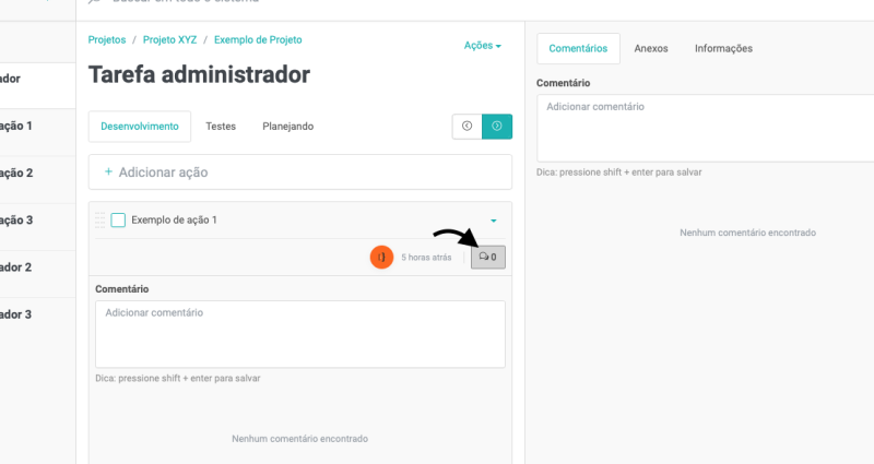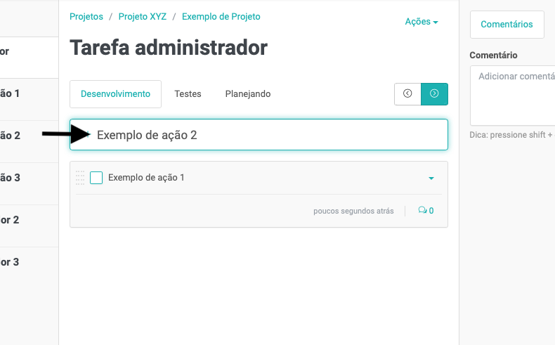 E, para adicionar comentários nas ações, clique no ícone de comentários, na ação desejada: