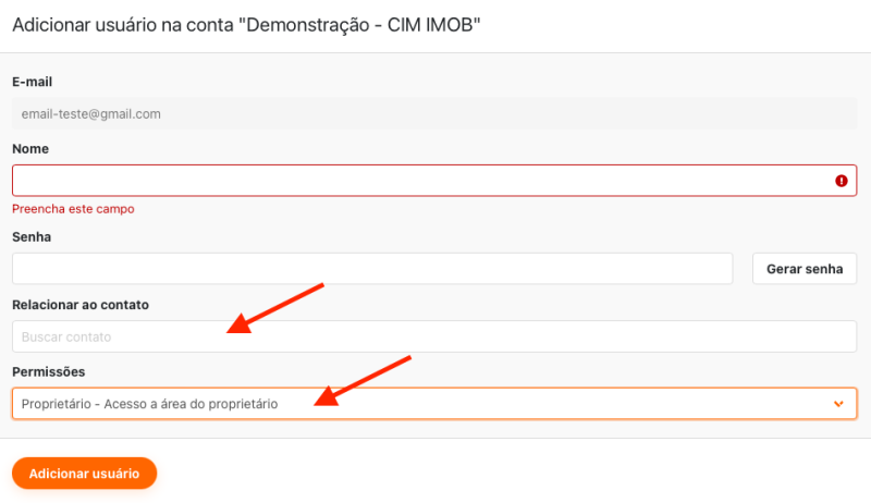 Certifique-se de relacionar o usuário com o contato do proprietário correto e selecionar as permissões de Acesso a área do proprietário