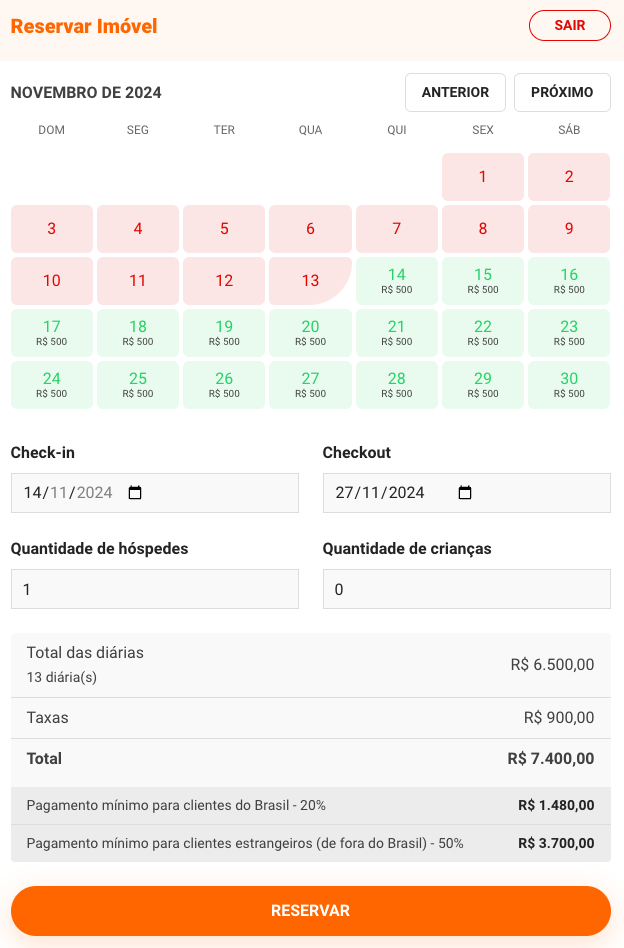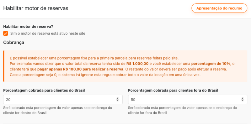 Agora você pode configurar o motor de reservas para cobrar um preço mínimo do cliente como taxa de reservas. Este preço será uma porcentagem do valor total da reserva.