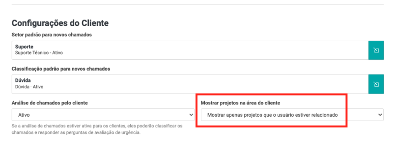 Para habilitar esse recurso acesse o menu Ajustes > Configurações gerais. No item Configurações do cliente, habilite a opção "Mostrar apenas projetos que o usuário estiver relacionaado", quando deseja exibir apenas os projetos e tarefas que estão relacionadas com o usuário. Para mostrar todos os projetos do cliente, marque a opção "Mostrar todos os projetos relacionados com o cliente do usuário".