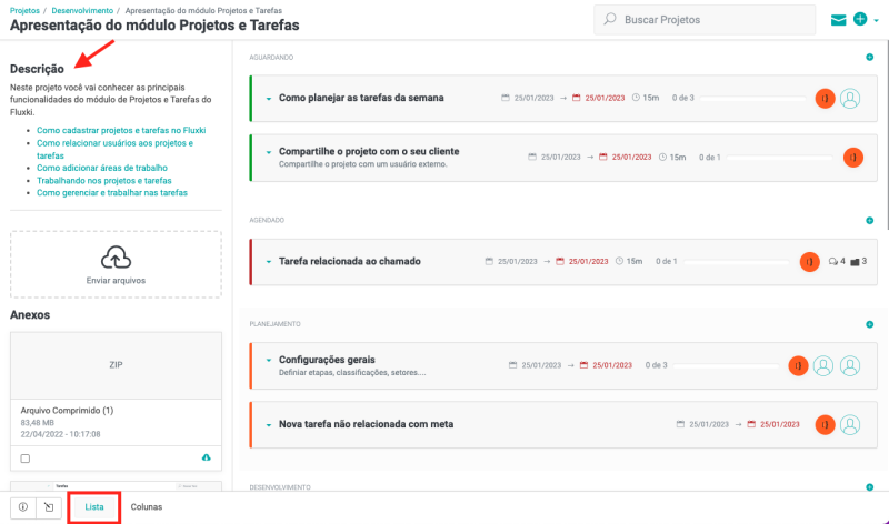 Agora fica visível as principais informações do projeto como a Descrição e os Anexos, facilitando a impressão do projeto (se necessário) e outras melhorias na lista de tarefas: