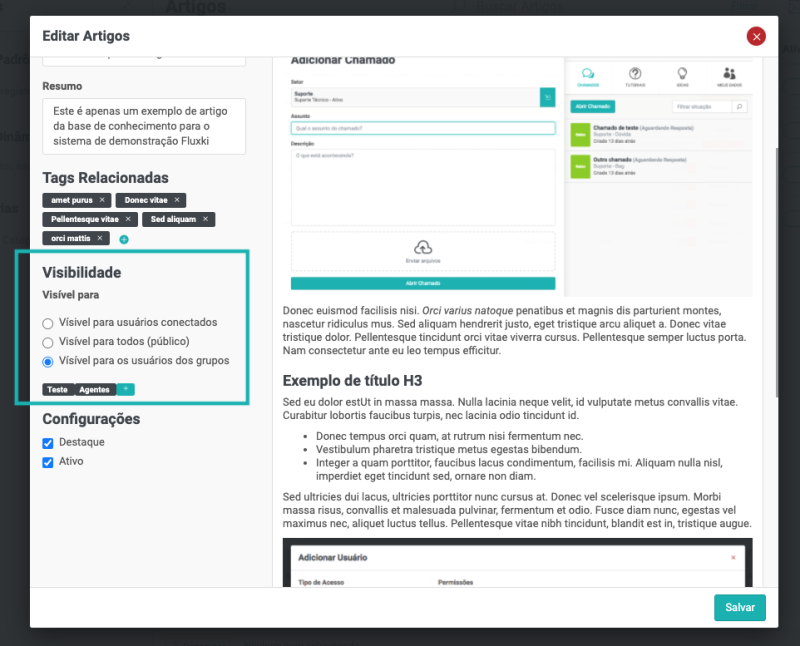 - Visível para usuários conectados - O artigo será exibido apenas para o usuário que está logado na base de conhecimento;