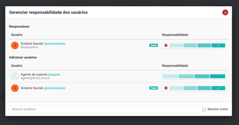 Para selecionar o usuário, encontre ele na lista e marque a permissão desejada. Os usuários relacionados serão listados em Responsáveis: