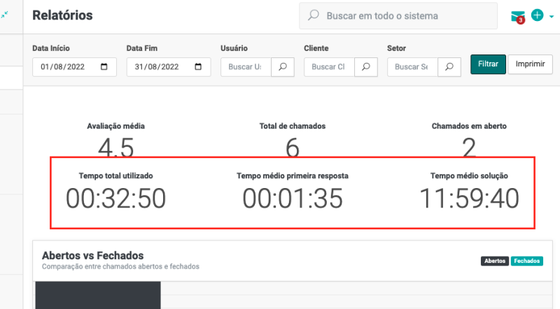 No relatório Chamados > Resumo Geral além do tempo total utilizado no período, também será exibido o tempo médio da primeira resposta e solução dos chamados: