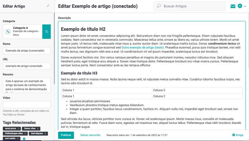 - O conteúdo editado é salvo automaticamente a cada 30s em rascunho;