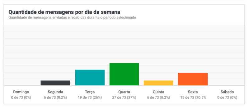 Agora está disponível no relatório Chamados > Resumo Geral o gráfico mostrando a quantidade de mensagens enviadas e recebidas por dia da semana. O gráfico é gerado conforme os filtros aplicados.