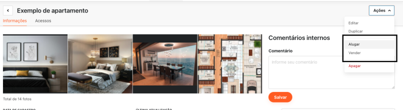 Na tela de visualizaçãodo imóvel, clique no botão de Ações, para acessar o atalho: